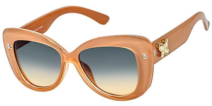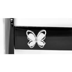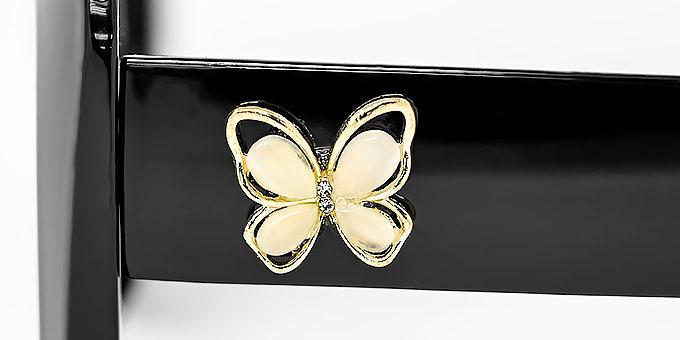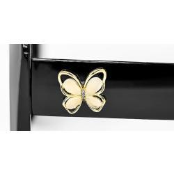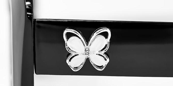 Metal butterfly shaped decor on temples in shiny gold and silver colors mixed.