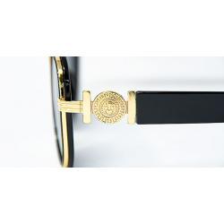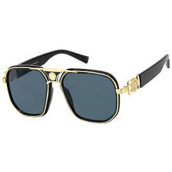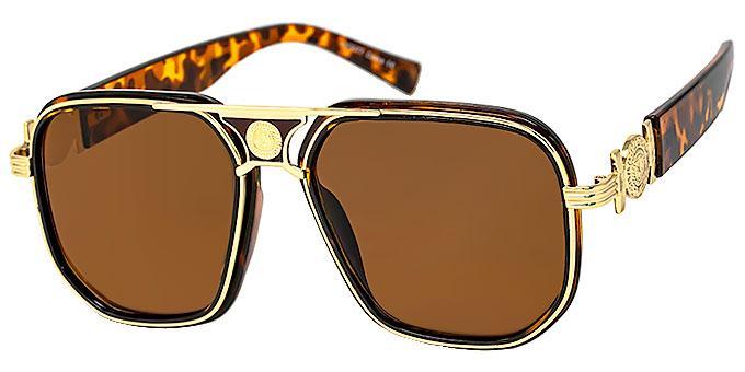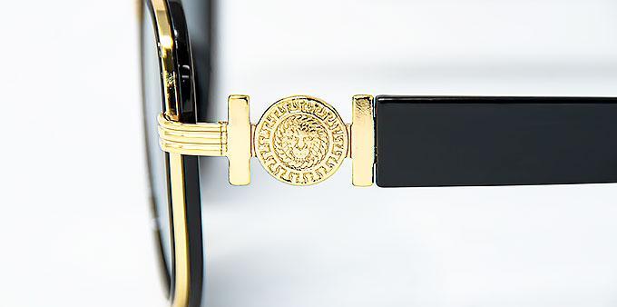 Lion head medallion decor on temples in shiny silver and gold colors and on middle of frames with black and brown rims.