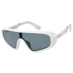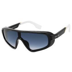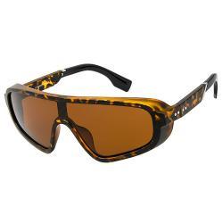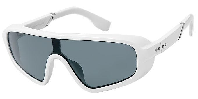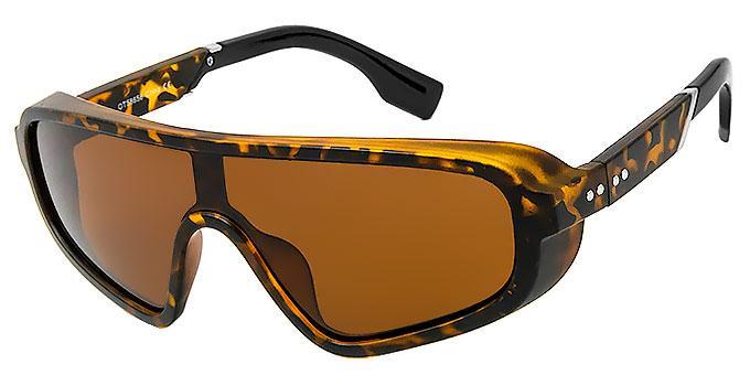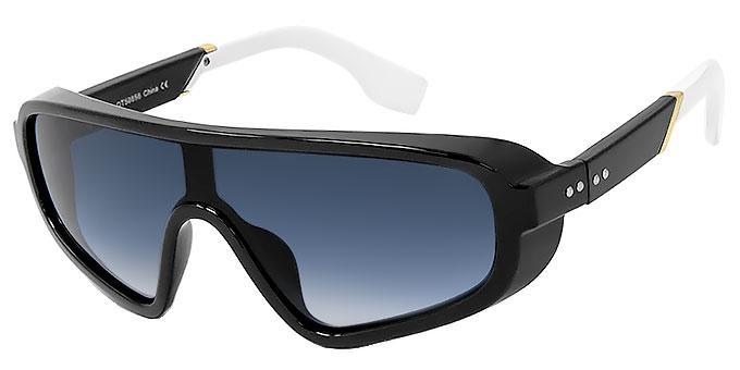 One-pieced lens with shiny silver studs on temples and shiny silver and gold parts near tips.