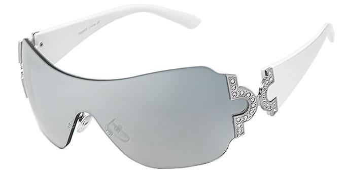 Rimless frames with one-pieced lens and clear rhinestone decor on temples.