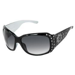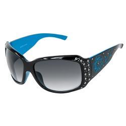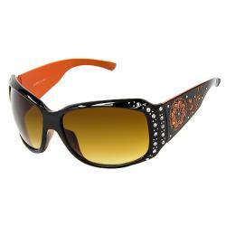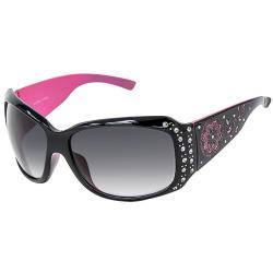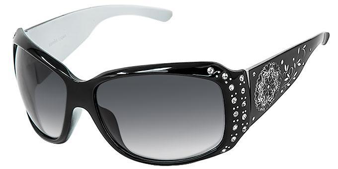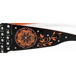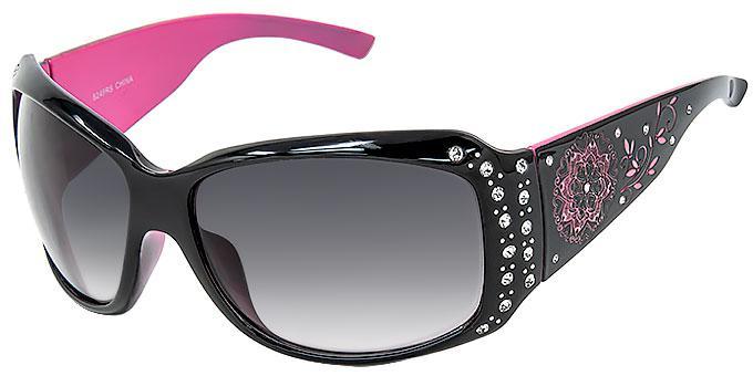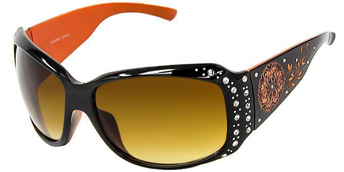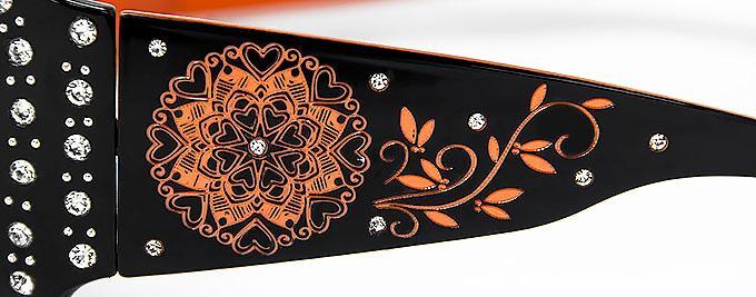 Plastic frame sunglasses with clear rhinestones and laser engraved floral decor on temples.