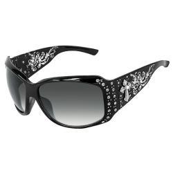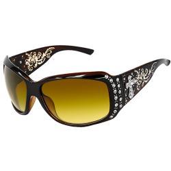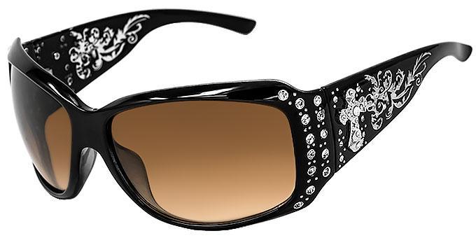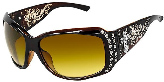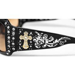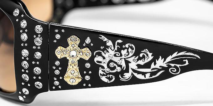 Shiny metal silver and gold cross parts on temples with clear rhinestone and silver studs decor on frames.