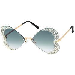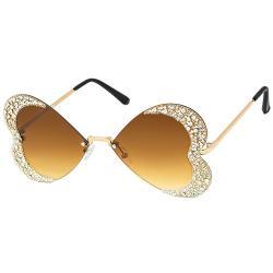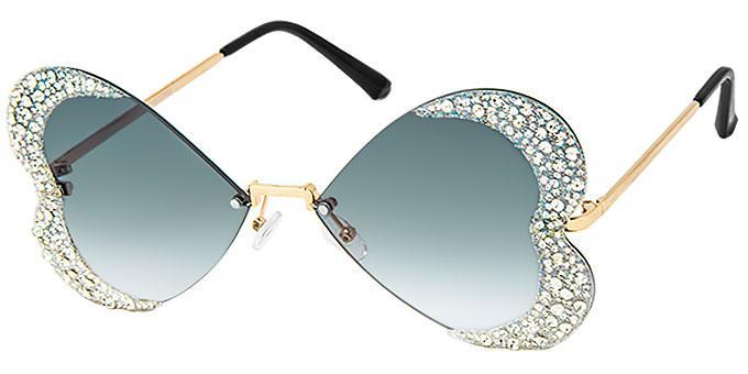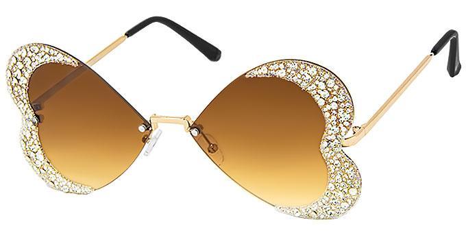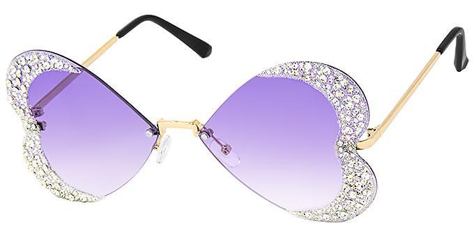 Rimless sideways heartshaped lens with clear rhinestone decor on sides of lens.