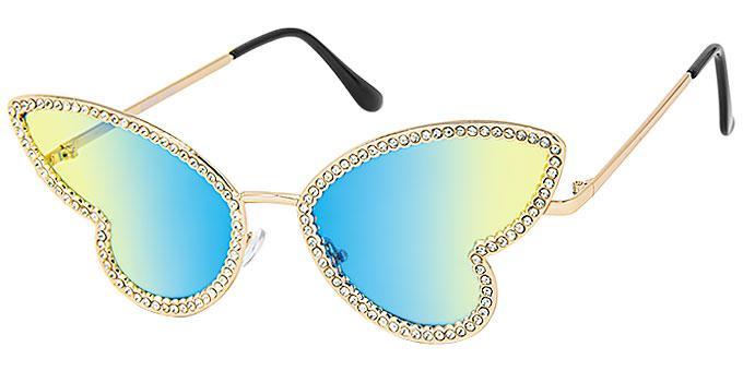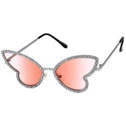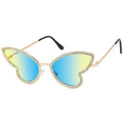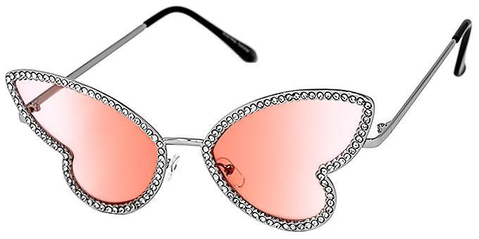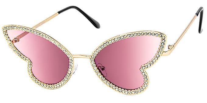 Butterfly shaped lens with clear rhinestone decor all around frames.