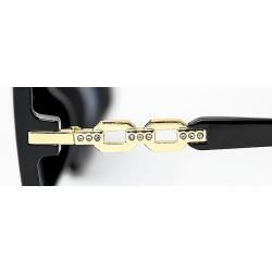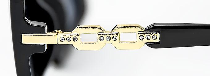 Has shiny gold chain link decor on temples with clear rhinestones.