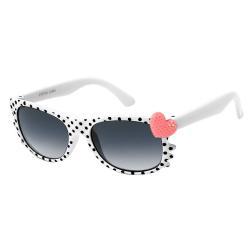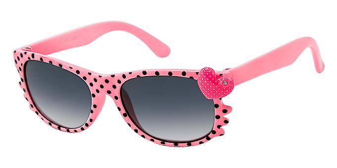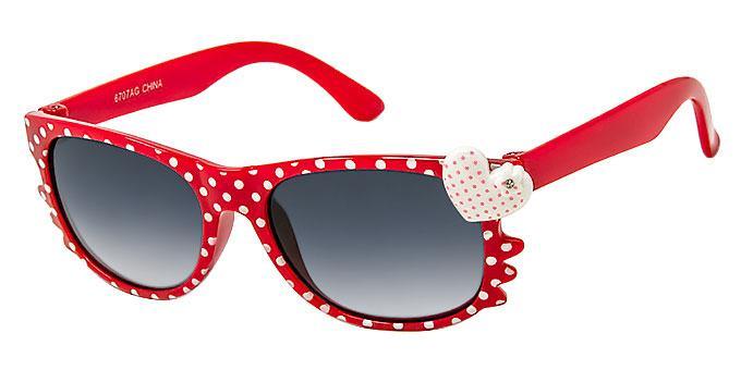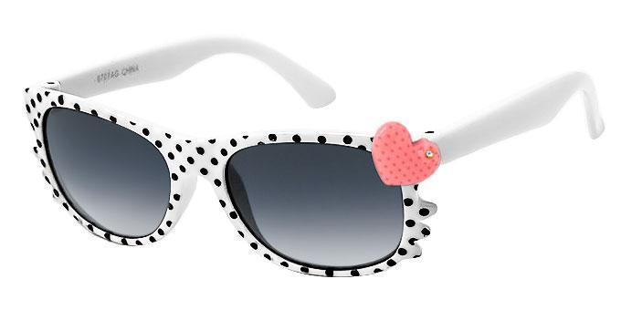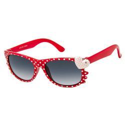 Kitty Heart ShadesPolk-a-dot imprinted girls sunglasses with wiskers. Heart shape design with a rhinestone attached to the frame. All smoke gradient PC lens.Frame colors in pink, red, black and white mixed in a dozen.