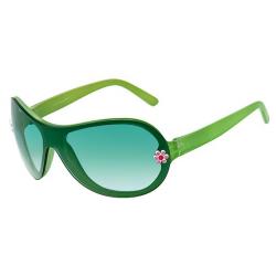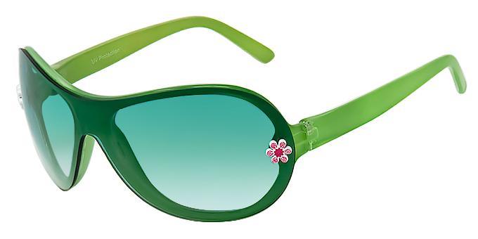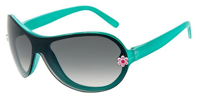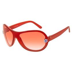 Has one-pieced lens with white and purple or white and red flower studs on each side of frames.