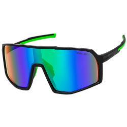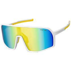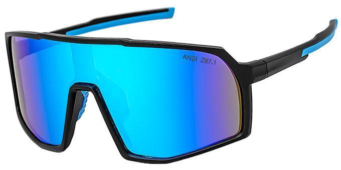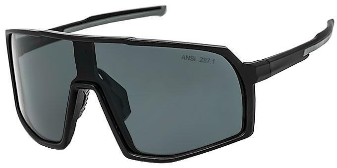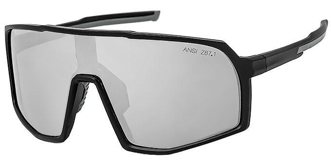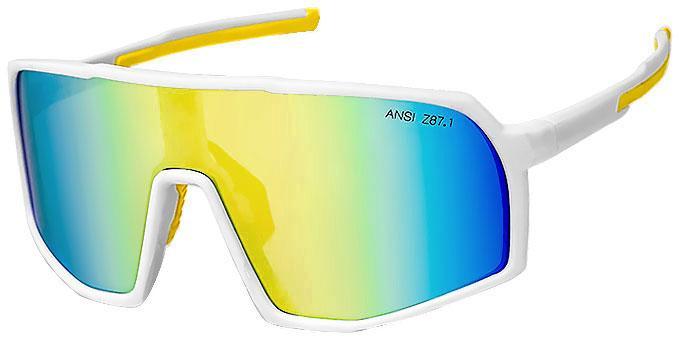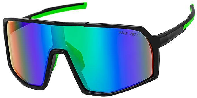 Sports wrap style with safety lenses and colored nose pads and rubber tips in grey, red, green, blue, and yellow. Meets Z87.1 safety standard.