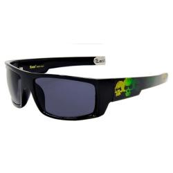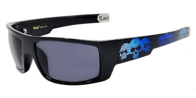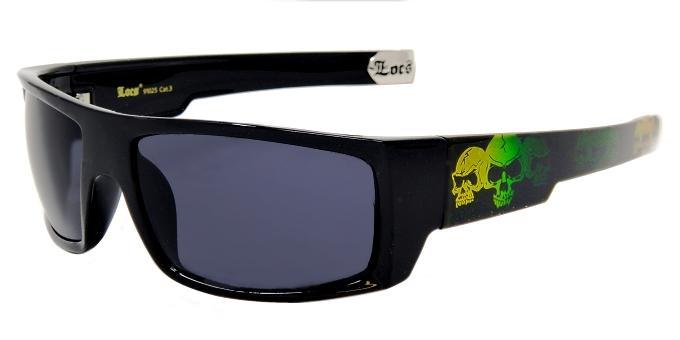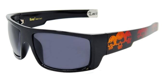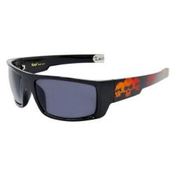 All shiny black frame plastic wraps with skulls imprints on temples.